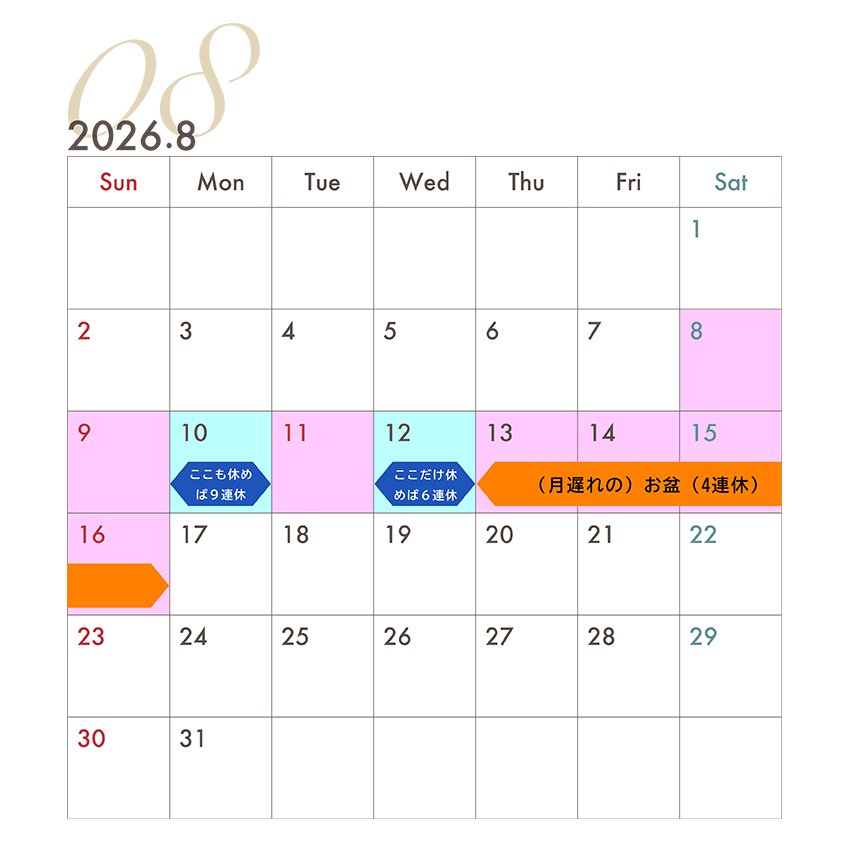 というわけで、2026年(令和8年)のお盆休み(夏季休暇)期間は8月13日(木)から16日(日)までの4連休です。10日(月)・12日(水)に有給休暇を取得することができれば、8月8日(土)から8月16日(日)まで9連休が可能となります。