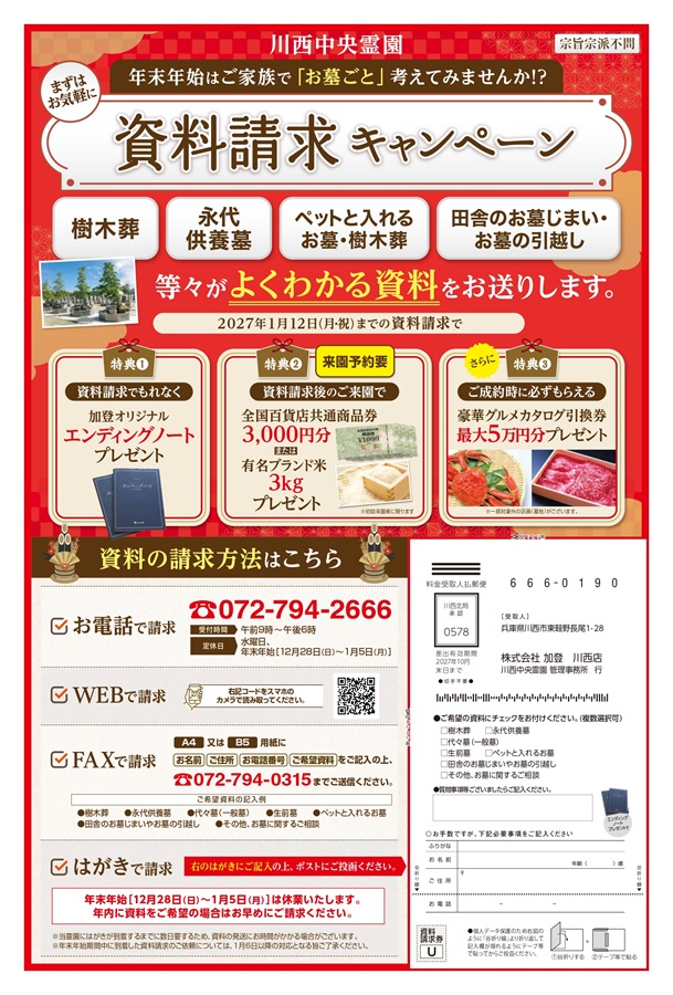 年末年始はご家族で「お墓ごと」考えてみませんか?資料請求・ご来園・ご成約ごとに特典を用意しております。