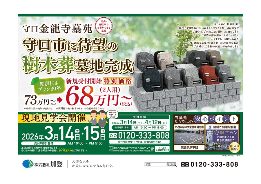 守口市【金龍寺墓苑】の現地見学会を受付開始いたします![受付期間:3/14(土)〜4/12(日)]