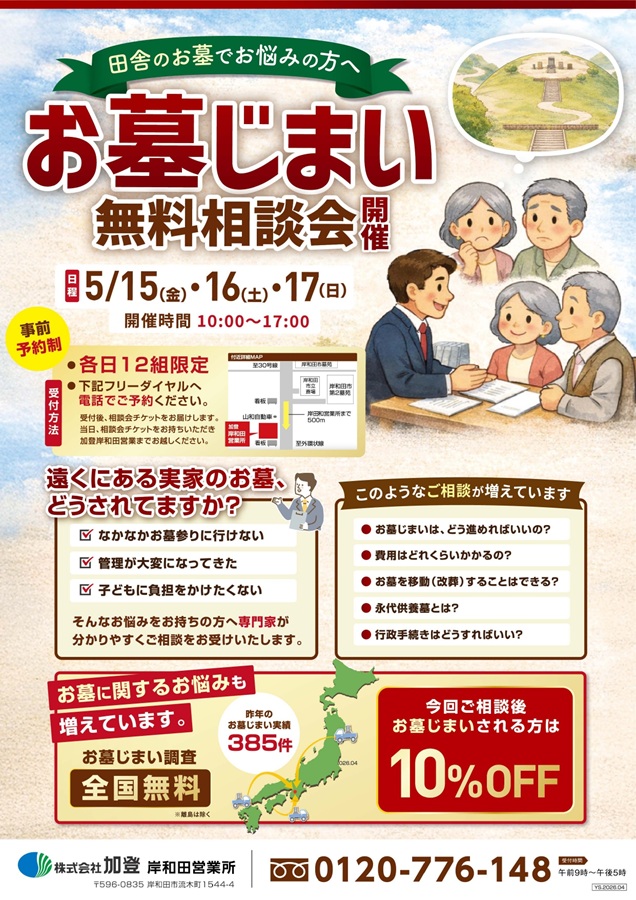 加登・岸和田営業所にて、5/15(金)16(土)17(日)お墓じまい無料相談会を開催します。