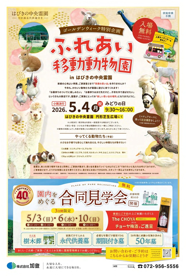 5月4日(月祝)はびきの中央霊園に移動動物園がやって来ます!人気のキッチンカーの出店も。