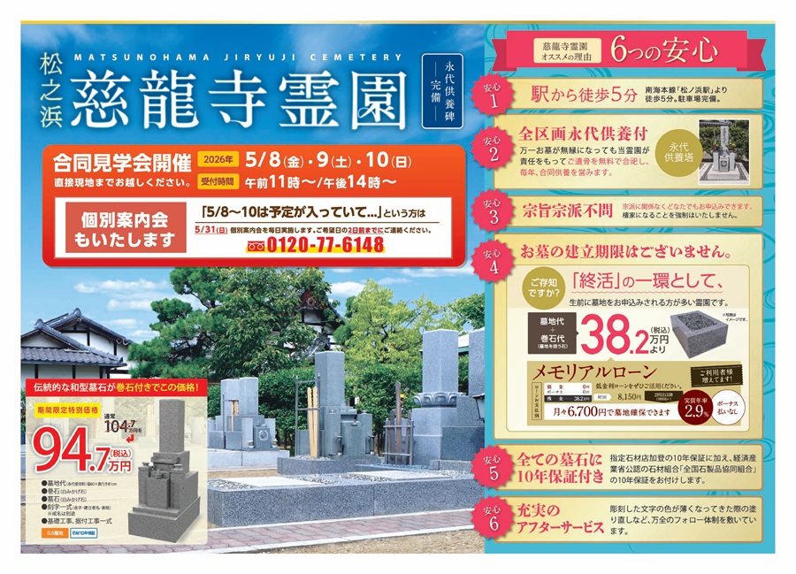 泉大津市【松之浜 慈龍寺霊園】にて、期間中の5/8(金)5/9(土)5/10(日)の3日間、合同見学会を開催!