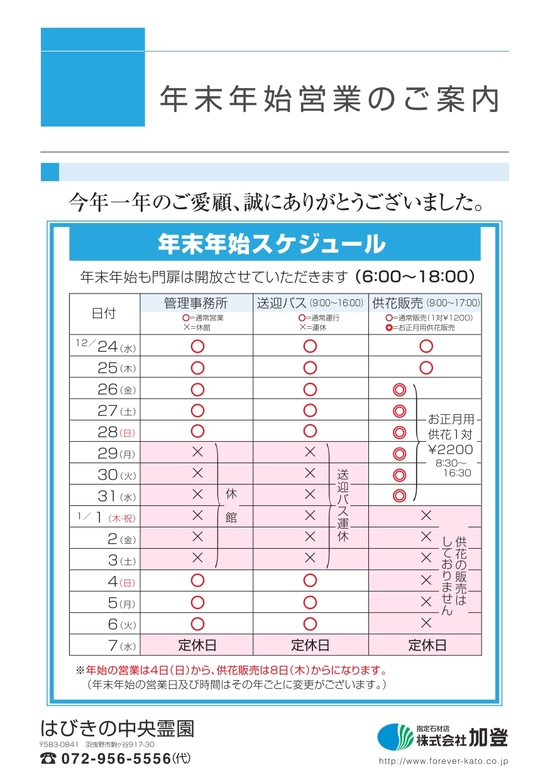はびきの中央霊園の年末年始スケジュール(2025~2026)をアップします。