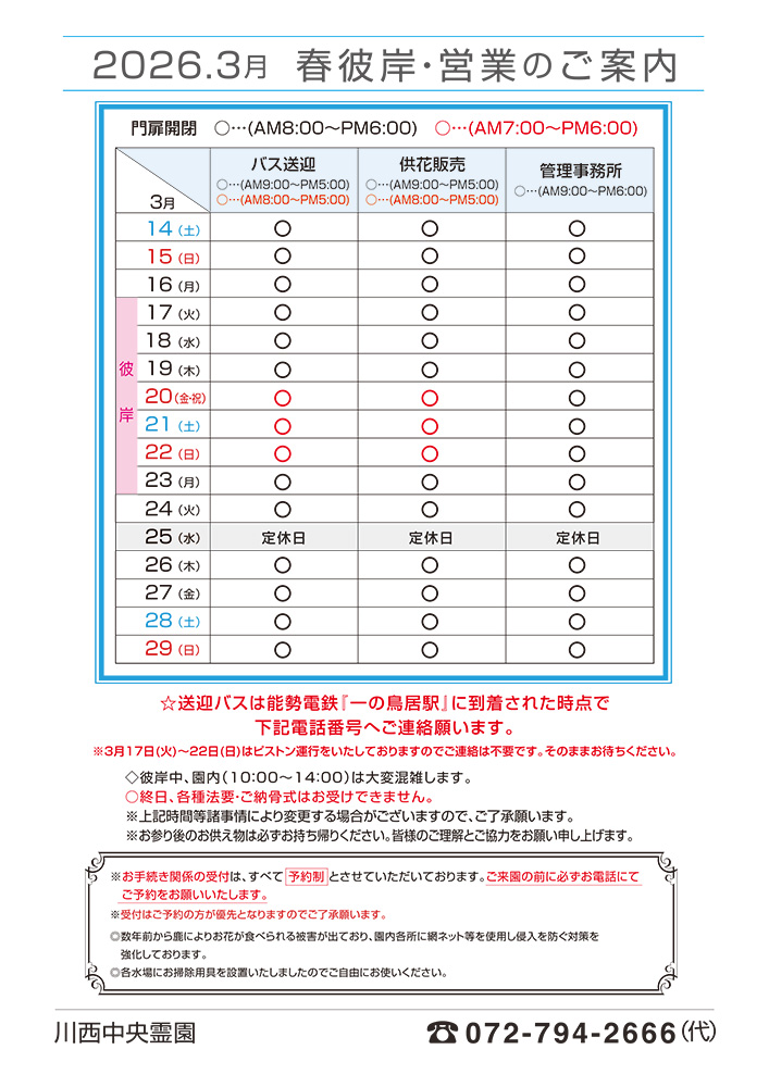 TOP › 新着情報一覧 › 令和8年3月 春のお彼岸営業スケジュール
