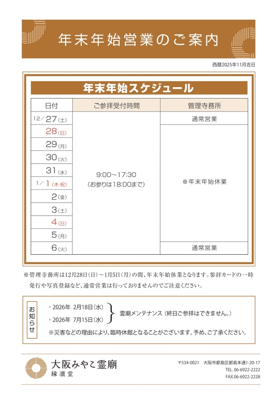 大阪みやこ霊廟 年末年始営業スケジュールについて