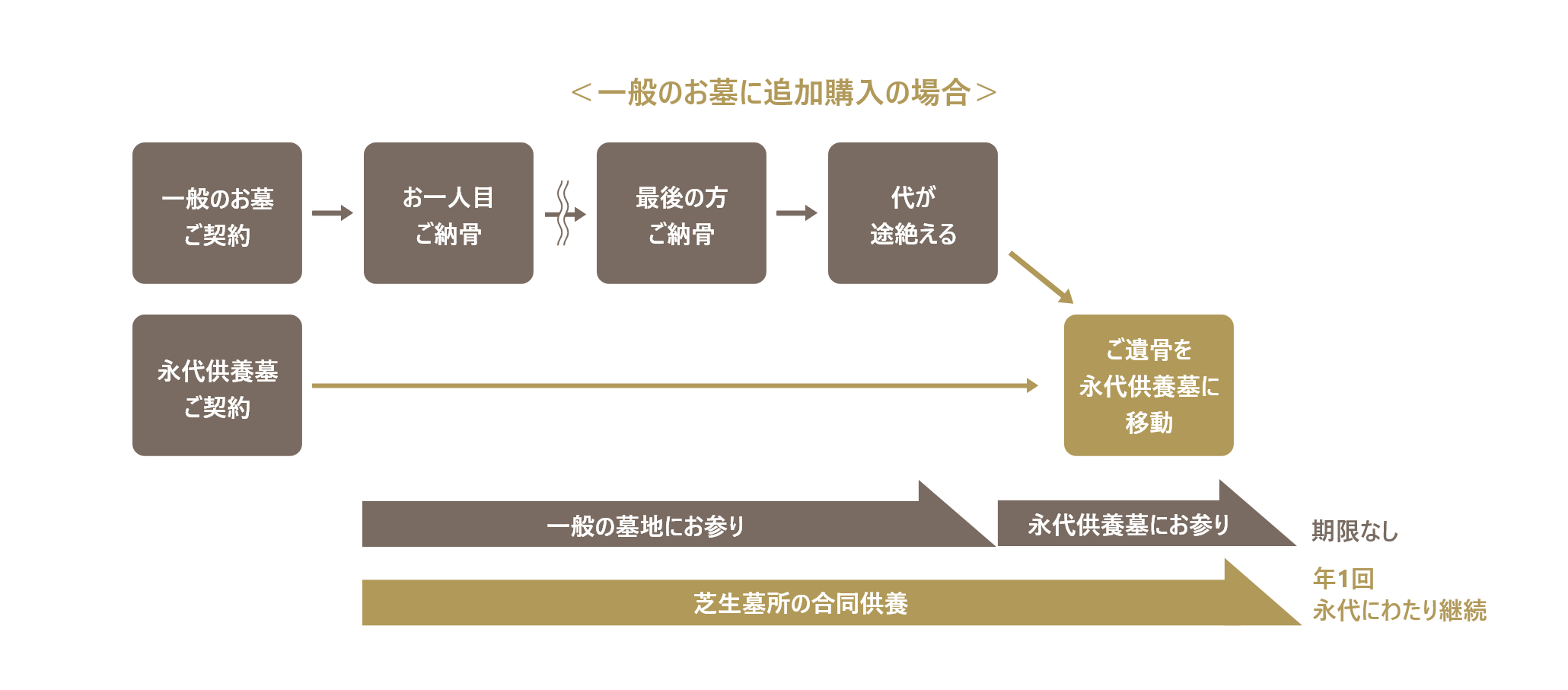 また、代々墓に追加でご購入いただけば、万一代が途絶えて代々墓が無縁になっても、ご遺骨は合祀せず芝生墓所に移し替え、個別に納骨・永代供養させていただきます。