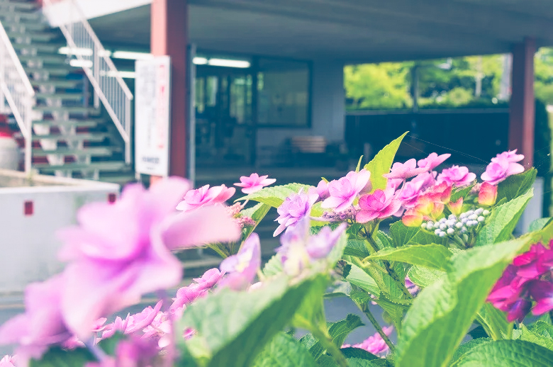 目に飛び込んできたのは、管理棟の向かいに咲き誇る鮮やかな花たち。