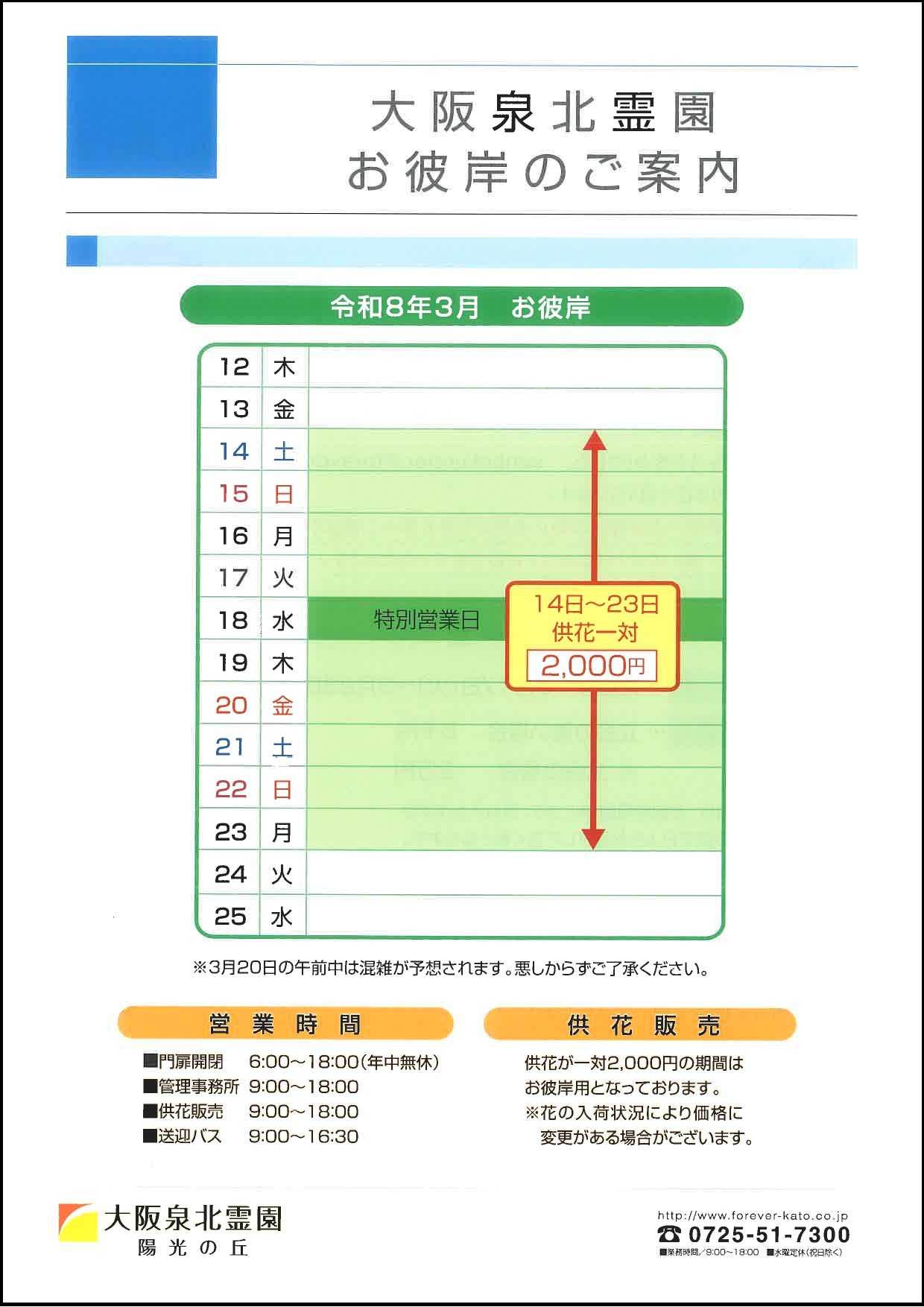 本日は、2026年(令和8年)「春のお彼岸」期間中の営業スケジュールおよび、墓前法要の受付についてご案内いたします。