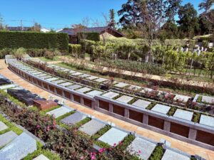 近代的なデザインの墓石は周囲のバラや乱形石張りの通路との調和も良く、